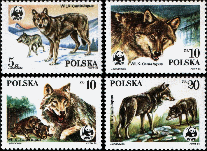 Numery znaczków: 2827 2828 2829 2830. Dzikie zwierzęta chronione - wilk 1985rok.